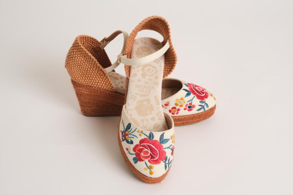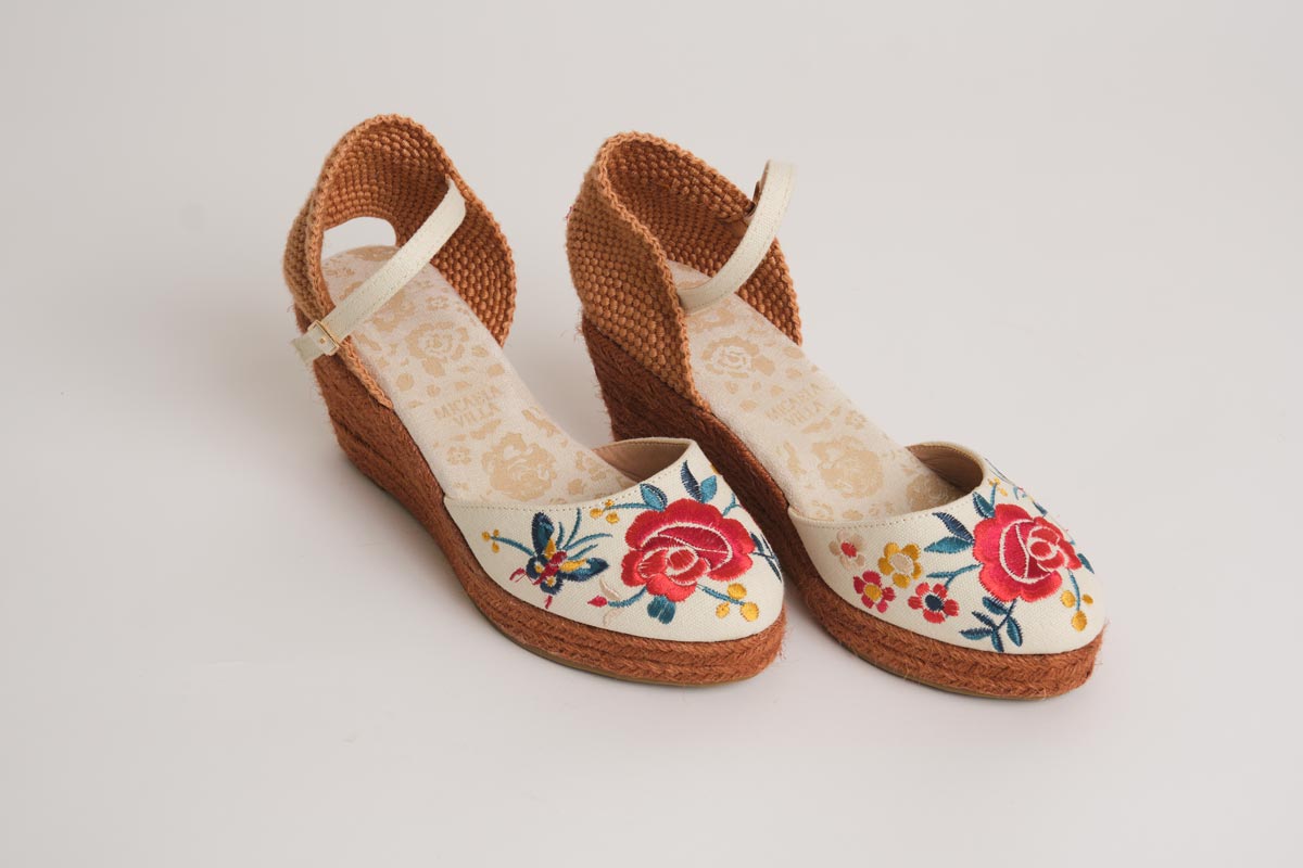 Alpargata de loneta de algodón con bordado a color de flores y mariposa.