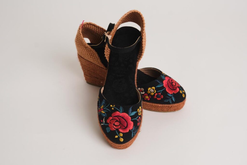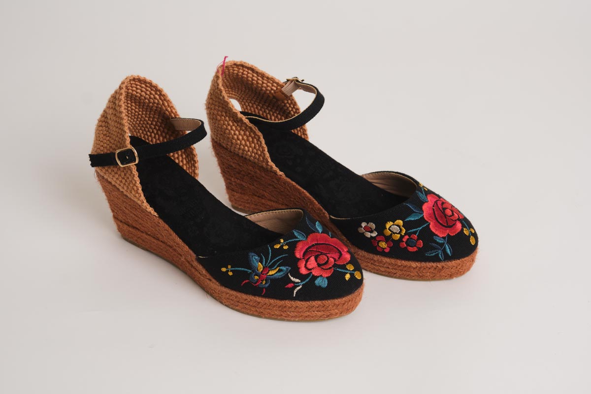 Alpargata de loneta de algodón con bordado a color de flores y mariposa.