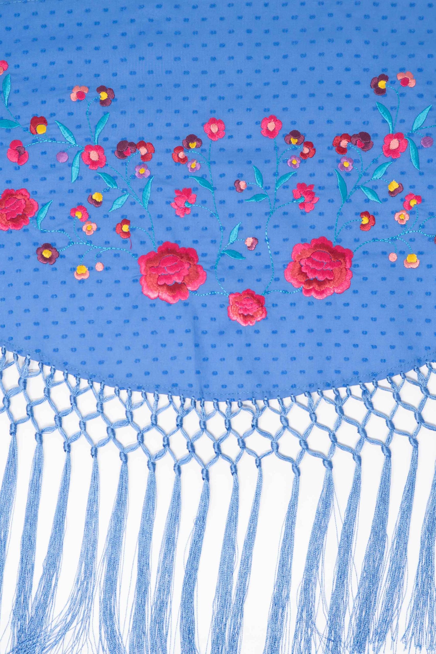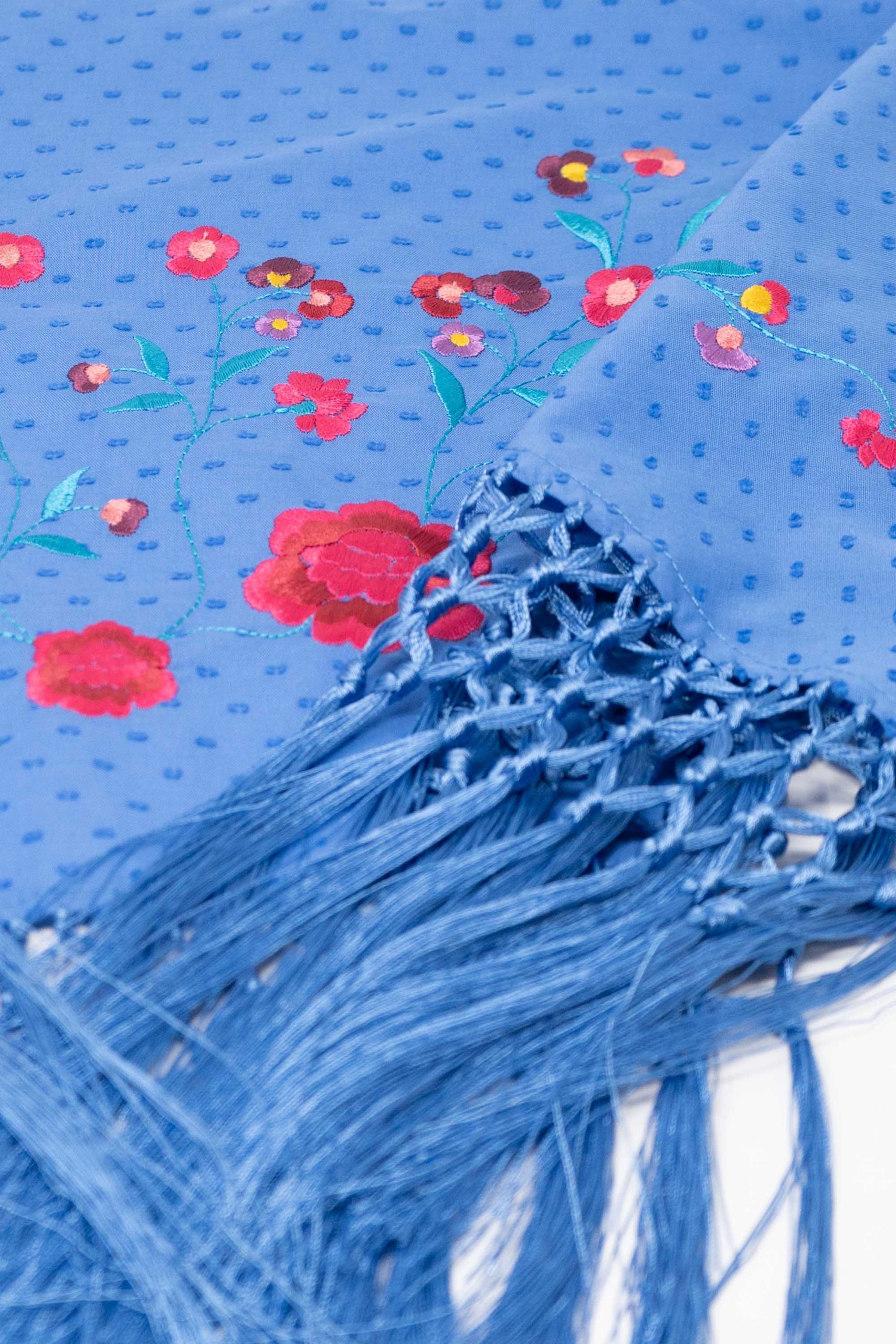 Mantoncillo de niña confeccionado en tejido de plumety de algodón con flecos al tono. Bordado con un diseño de flores de varios tamaños y vivos colores.