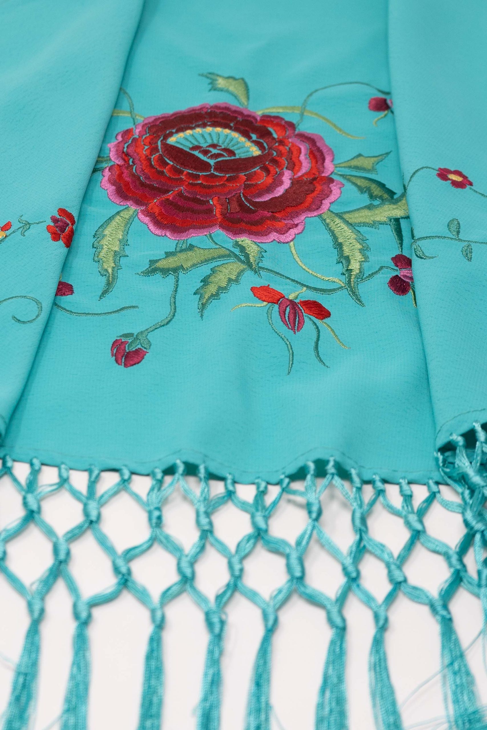 Mantoncillo de niña confeccionado en tejido de poliester con flecos al tono. Bordado con un diseño de rosa central y festón de florecillas.