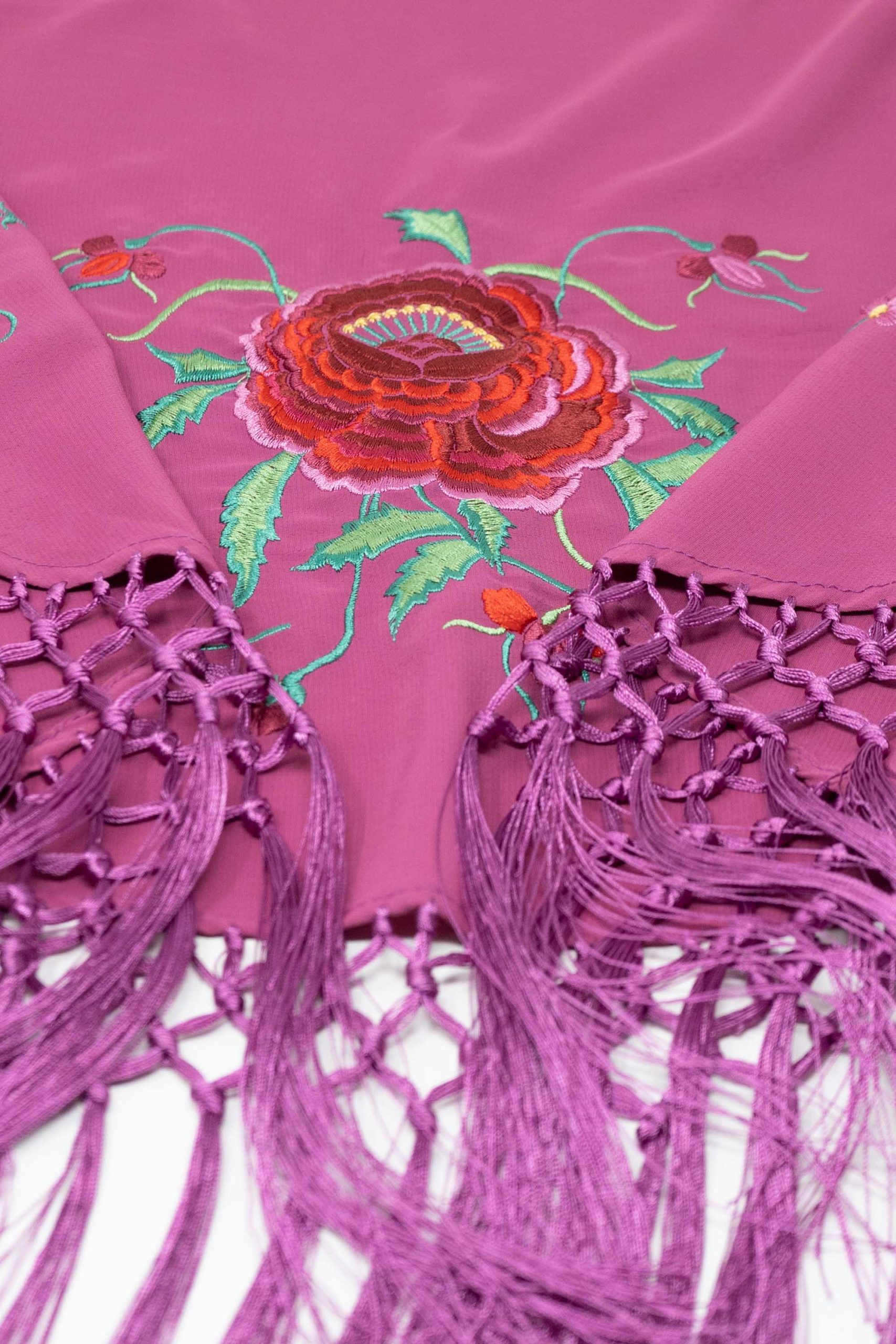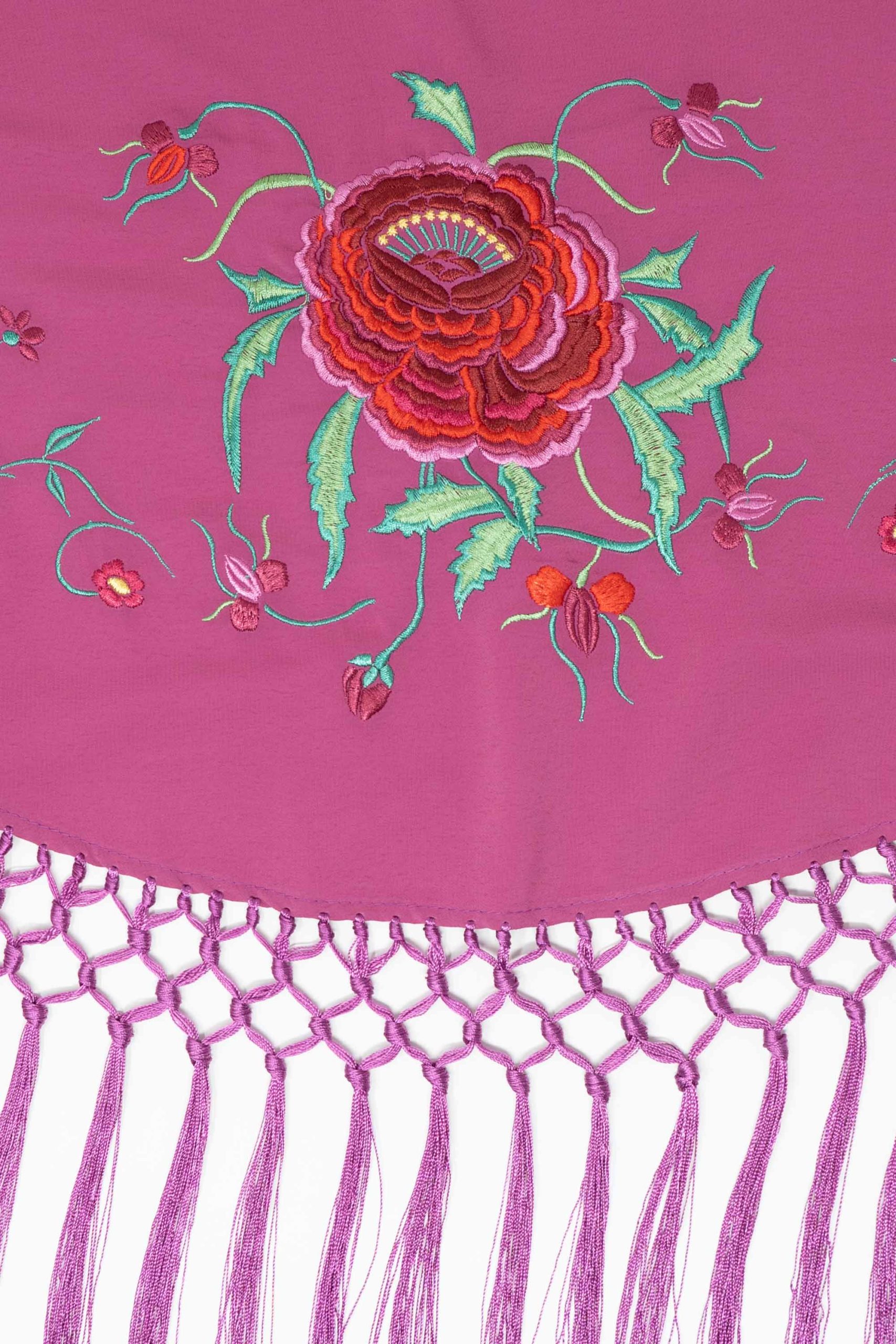 Mantoncillo de niña confeccionado en tejido de poliester con flecos al tono. Bordado con un diseño de rosa central y festón de florecillas.