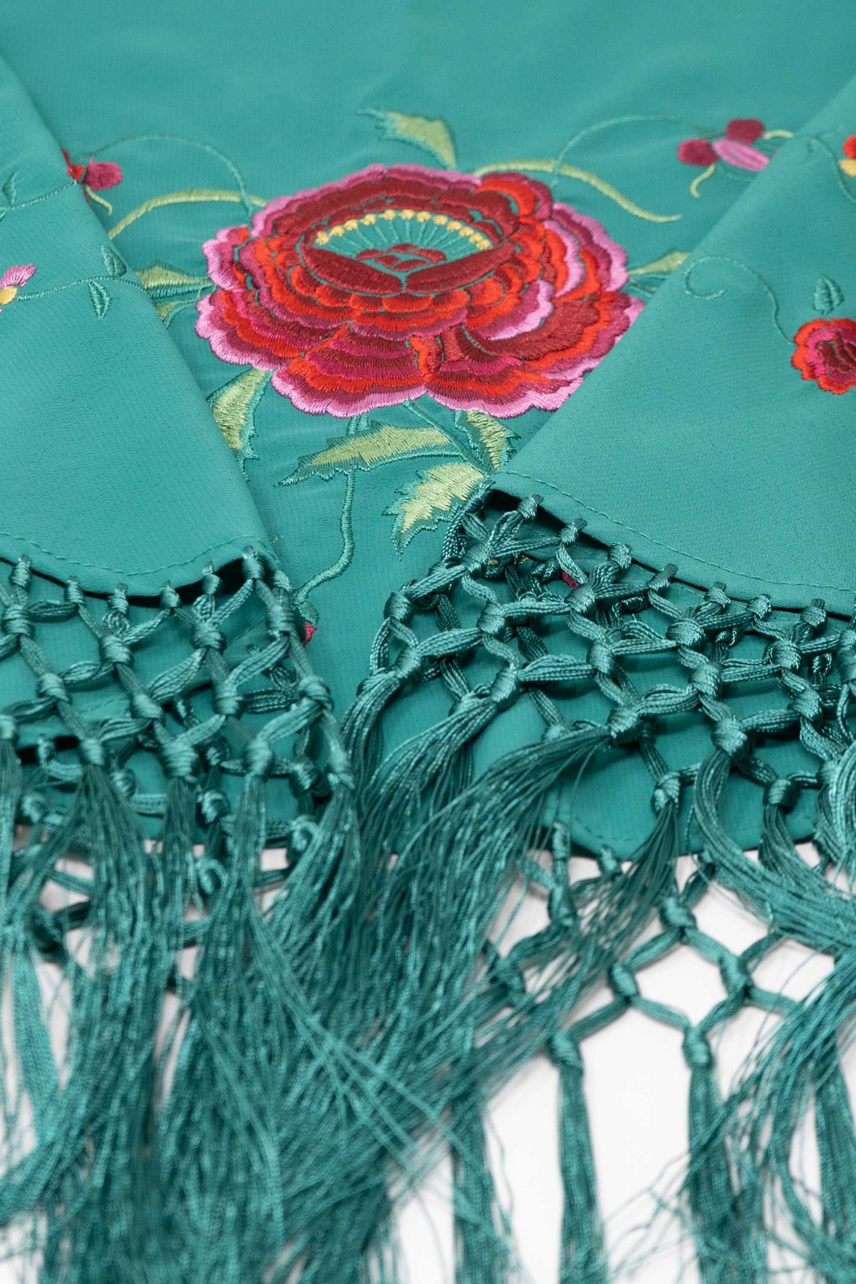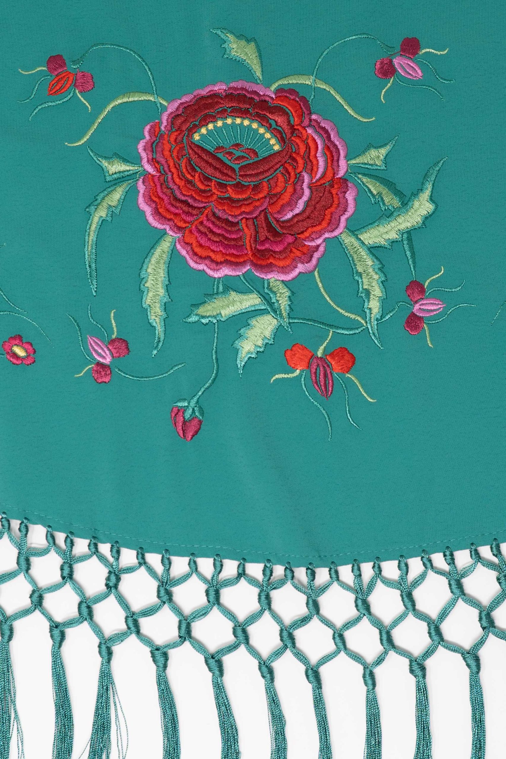 Mantoncillo de niña confeccionado en tejido de poliester con flecos al tono. Bordado con un diseño de rosa central y festón de florecillas.