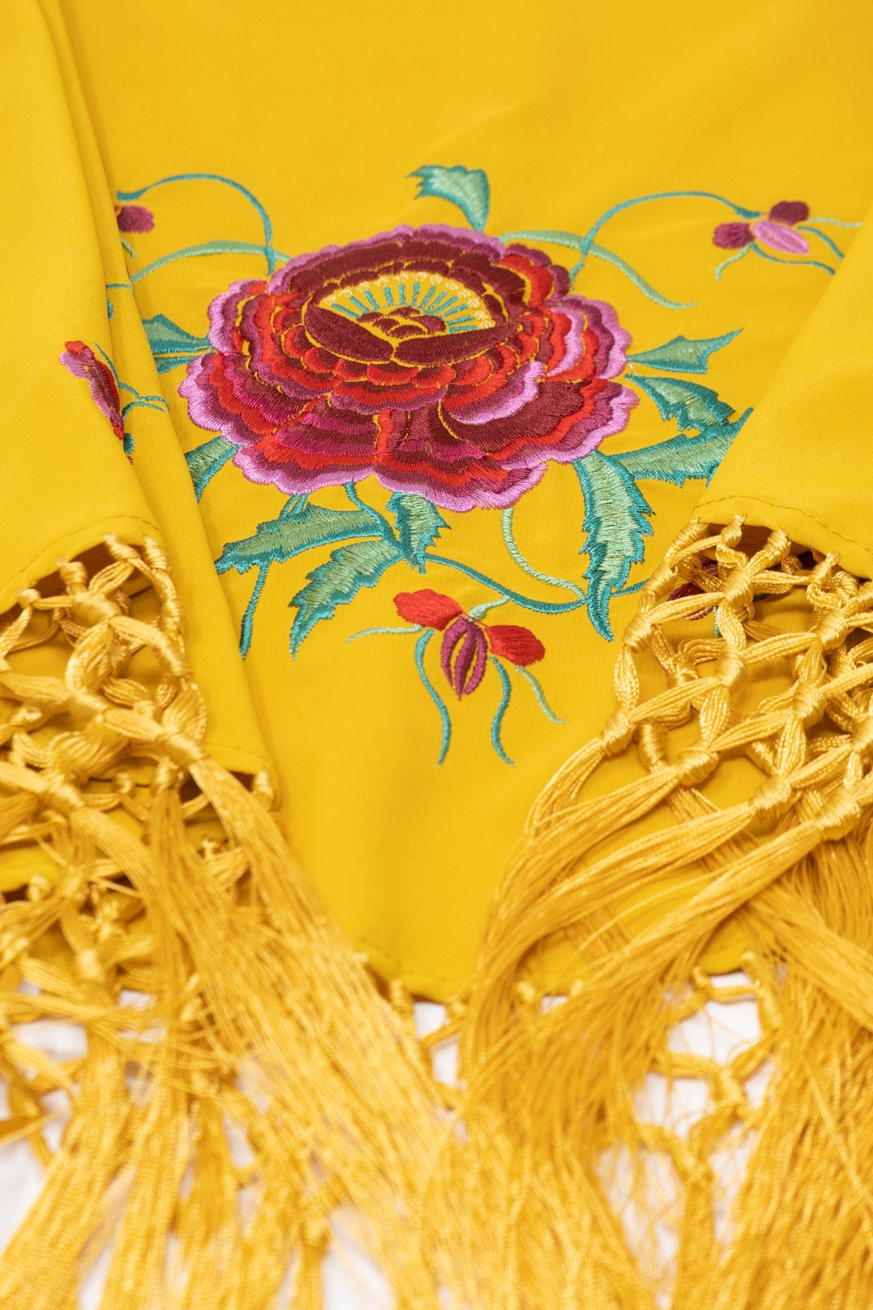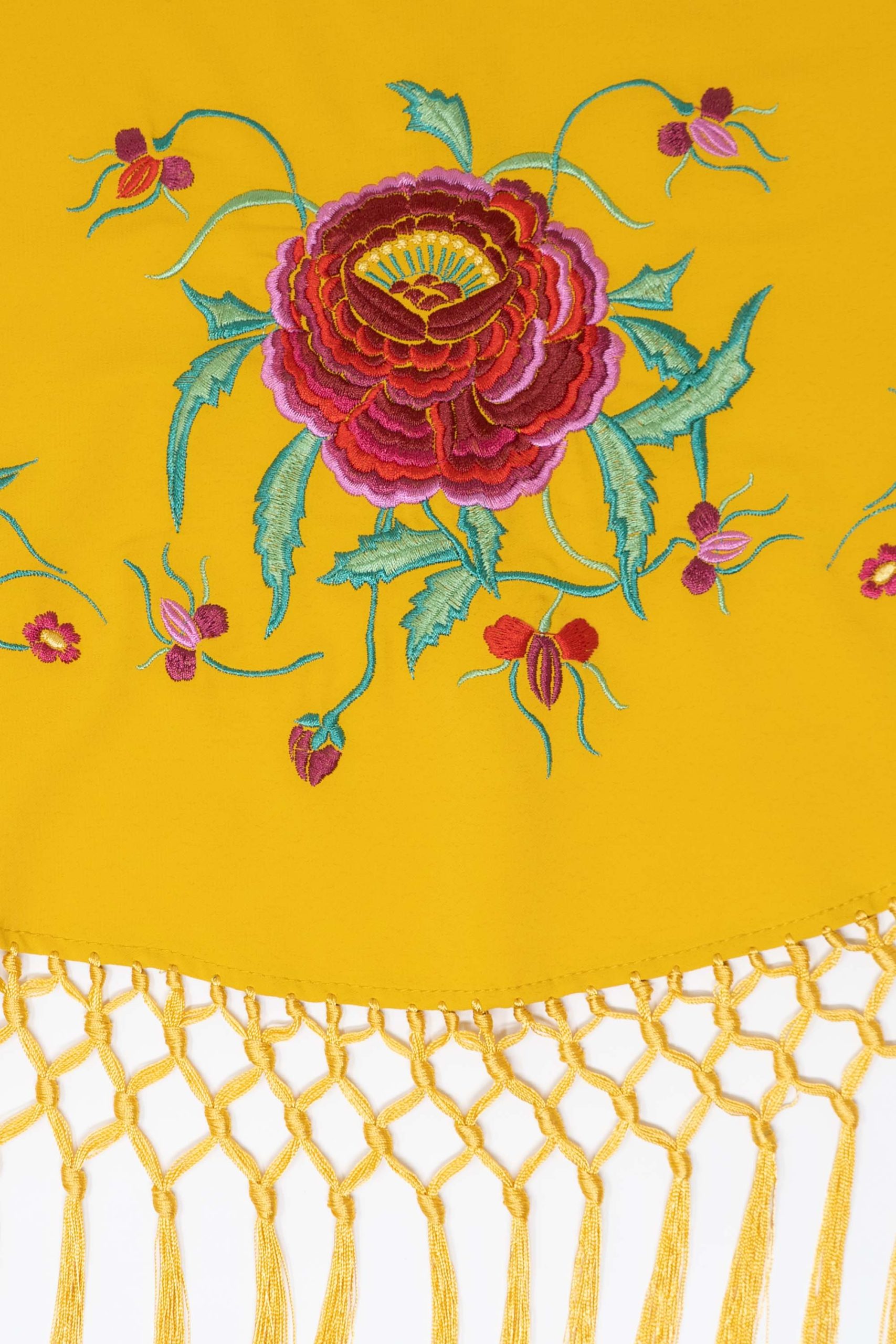 Mantoncillo de niña confeccionado en tejido de poliester con flecos al tono. Bordado con un diseño de rosa central y festón de florecillas.