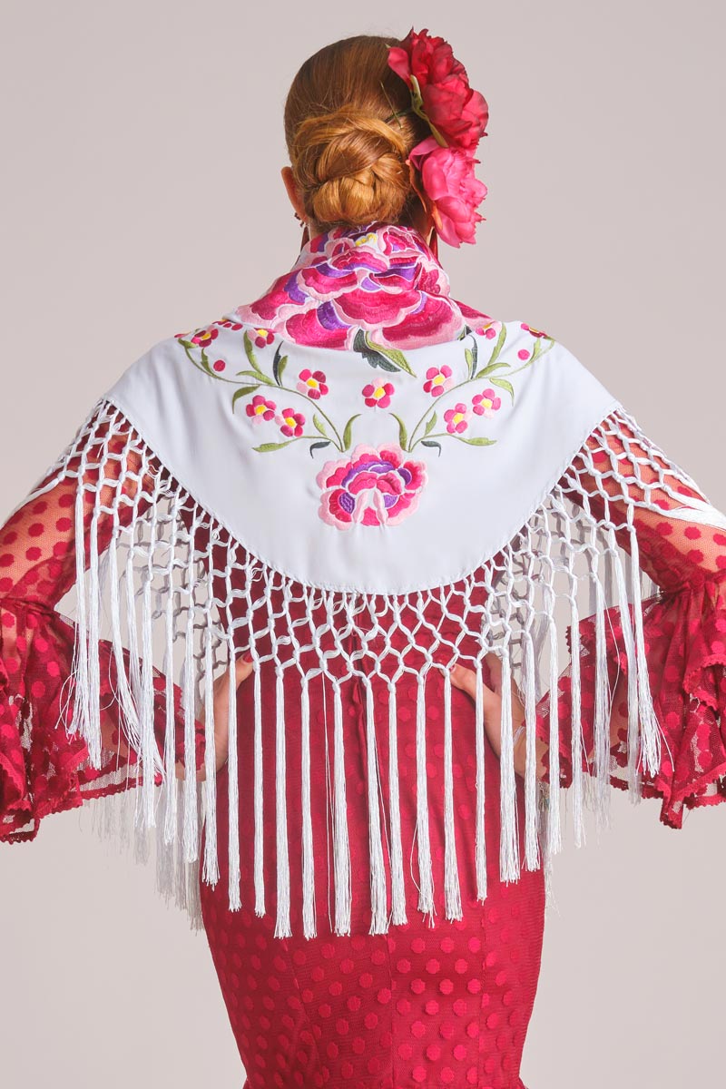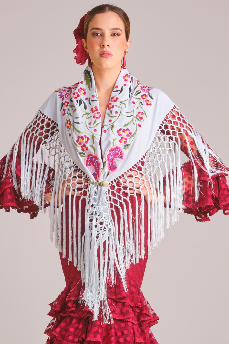 Mantón bordado confeccionado en crepé con flecos al tono.