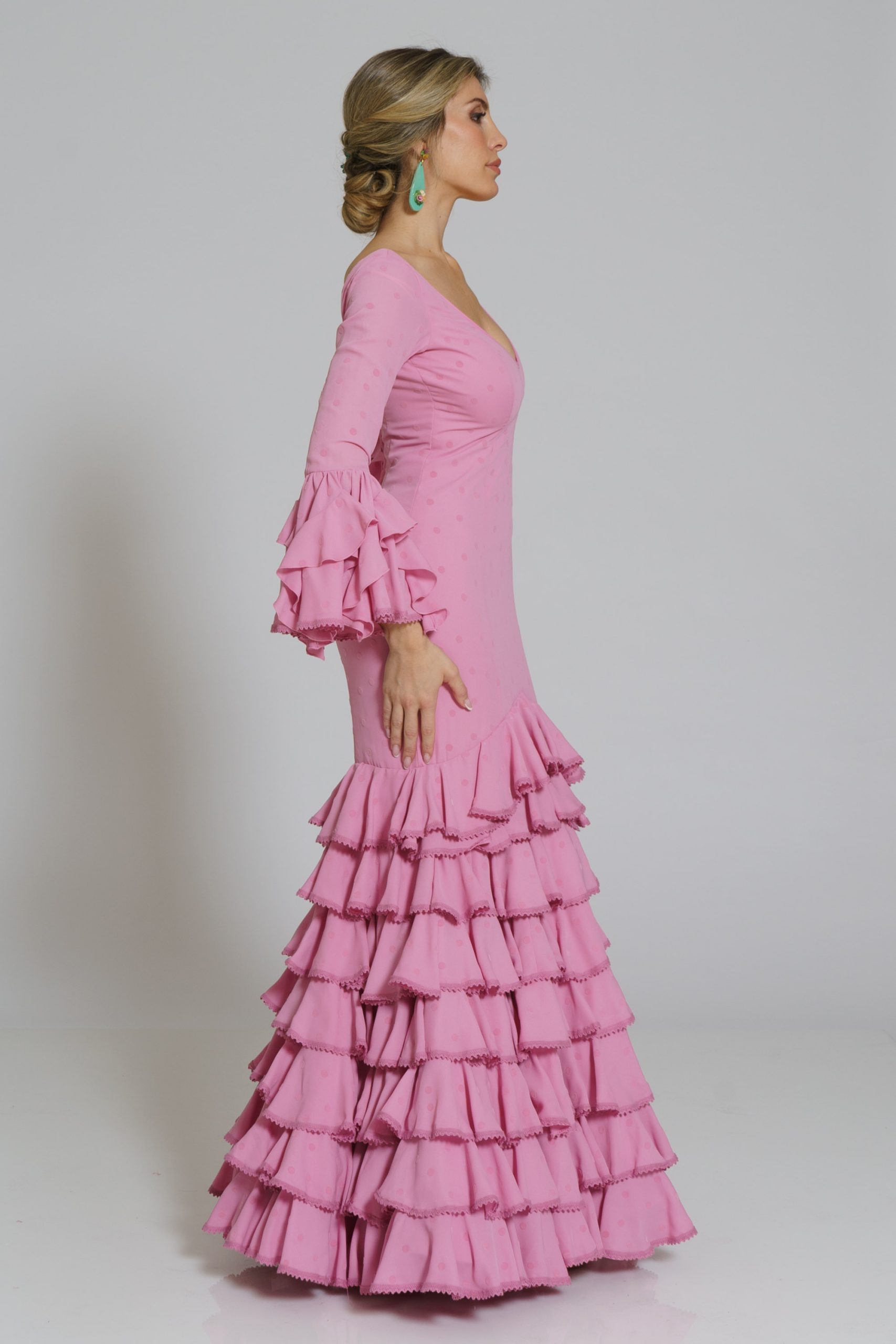 Vestido de georgette con lunares de terciopelo al tono. Patrón con siete volantes y talle bajo cadera. El primer volante y más alto está cosido en pico en el centro delantero, dándole un toque muy sofisticado al diseño. Los volantes van rematados con un original encaje de algodón de 1,5 cm de ancho con diseño de ondulina y al tono del vestido. El escote es clásico de pico en el delantero y en la espalda. El de la espalda baja más dándole un toque más sensual y atrevido al vestido.Las mangas son largas con un acabado muy original pues llevan un volante de capa largo sobre el que va cosido otro pequeño haciendo zig-zag. El vestido lleva una falda interior con un volante de cancan al tono del tejido para darle mas abertura y vuelo al bajo del vestido. Bajo esta falda interior lleva un bolsillo y presillas para el cuelgue.