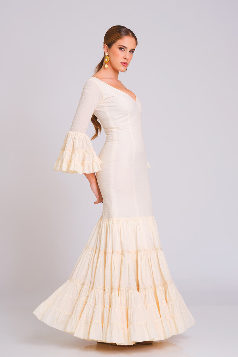 Vestido de de plumety algodón liso con talle bajo y de corte canastero, buque insignia de nuestra firma. La falda canastera se divide en 6 piezas fruncidas con con pasacinta de algodón al tono sobre las costuras de los cortes de volantes. Escote de pico con cordoncillo en delantero y espalda y presilla para asegurar el cierre. Las mangas largas con volante canastero de tres cortes y sus fortinuras al igual que los volantes de la falda.