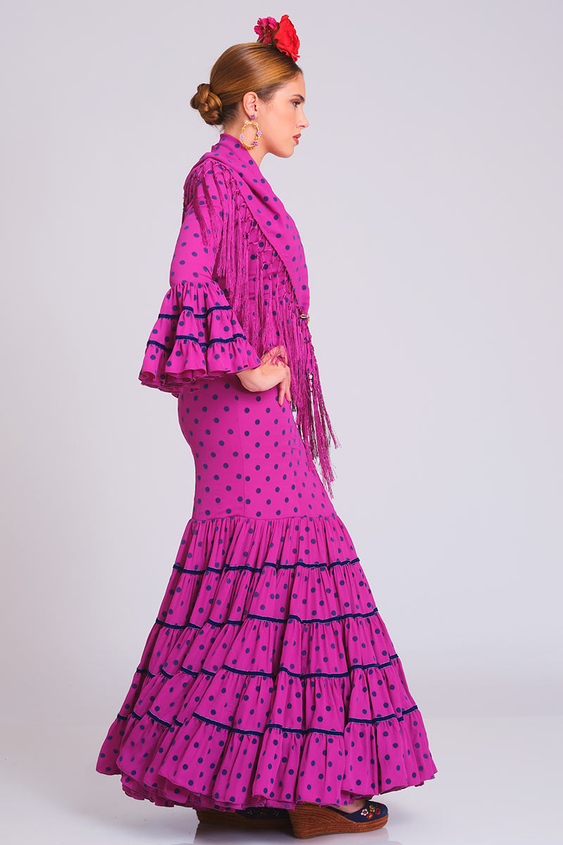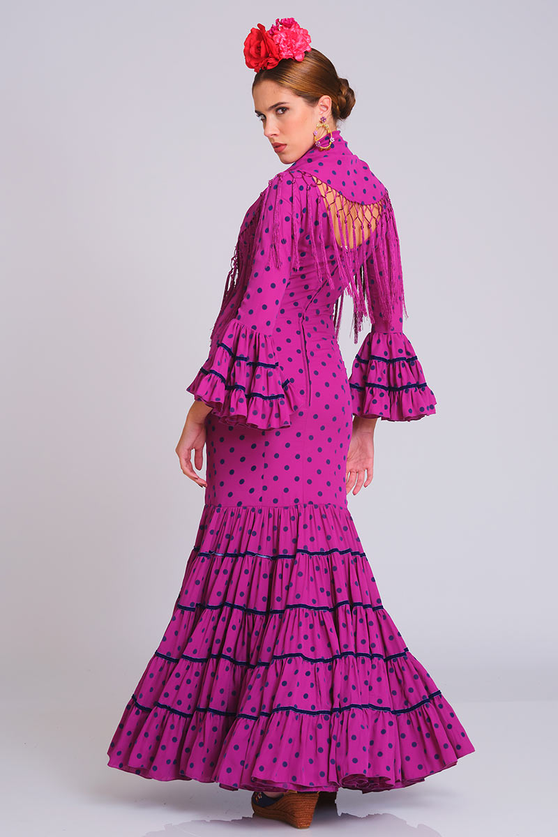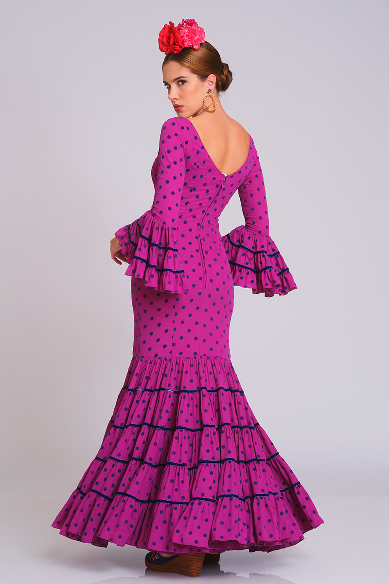 El corte canastero en la falda se divide en 5 piezas o falsos volantes con fornitura de terciopelo en contraste como el lunar entre costuras. Corte sirena con talle bajo y escote de pico con cordoncillo y presilla en la espalda. Las mangas largas con volante canastero de tres cortes y sus fortinuras al igual que los volantes de la falda.