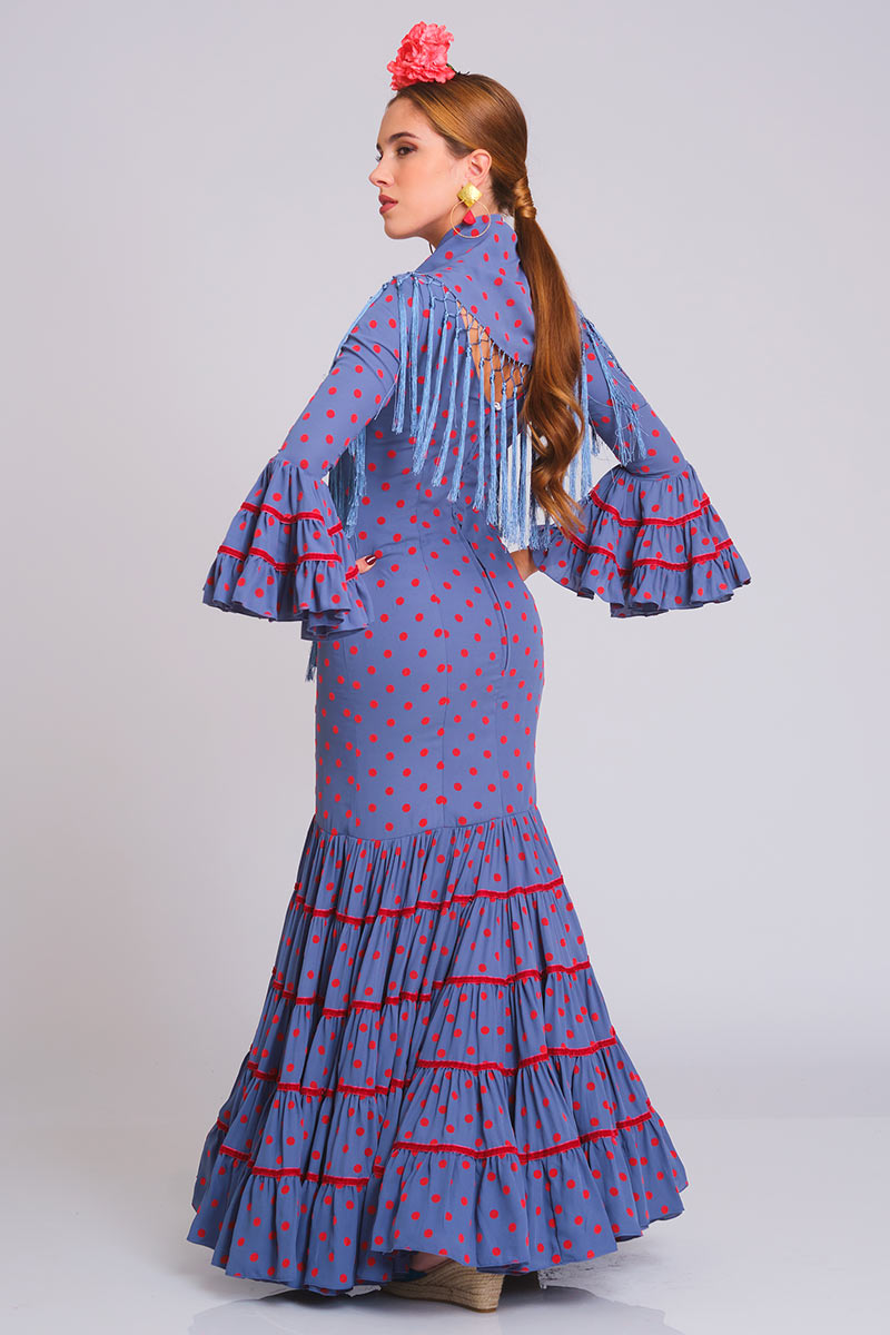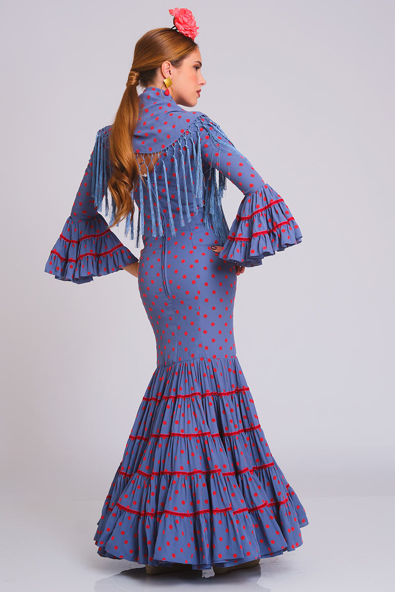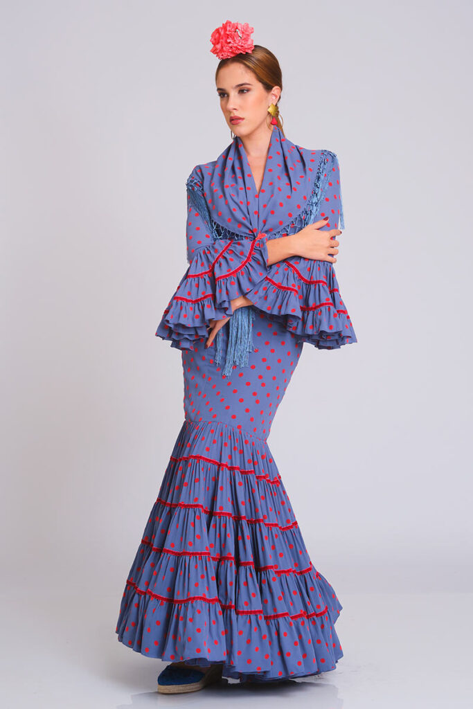 El corte canastero en la falda se divide en 5 piezas o falsos volantes con fornitura de terciopelo en contraste como el lunar entre costuras. Corte sirena con talle bajo y escote de pico con cordoncillo y presilla en la espalda. Las mangas largas con volante canastero de tres cortes y sus fortinuras al igual que los volantes de la falda.