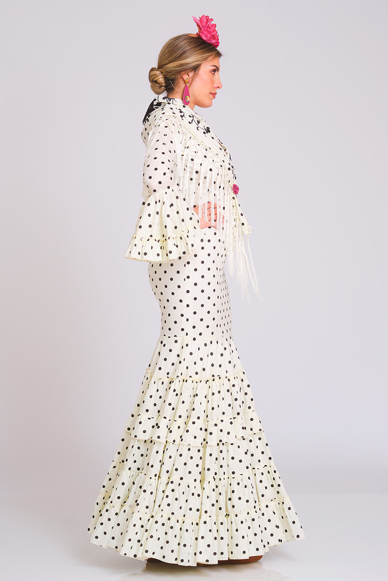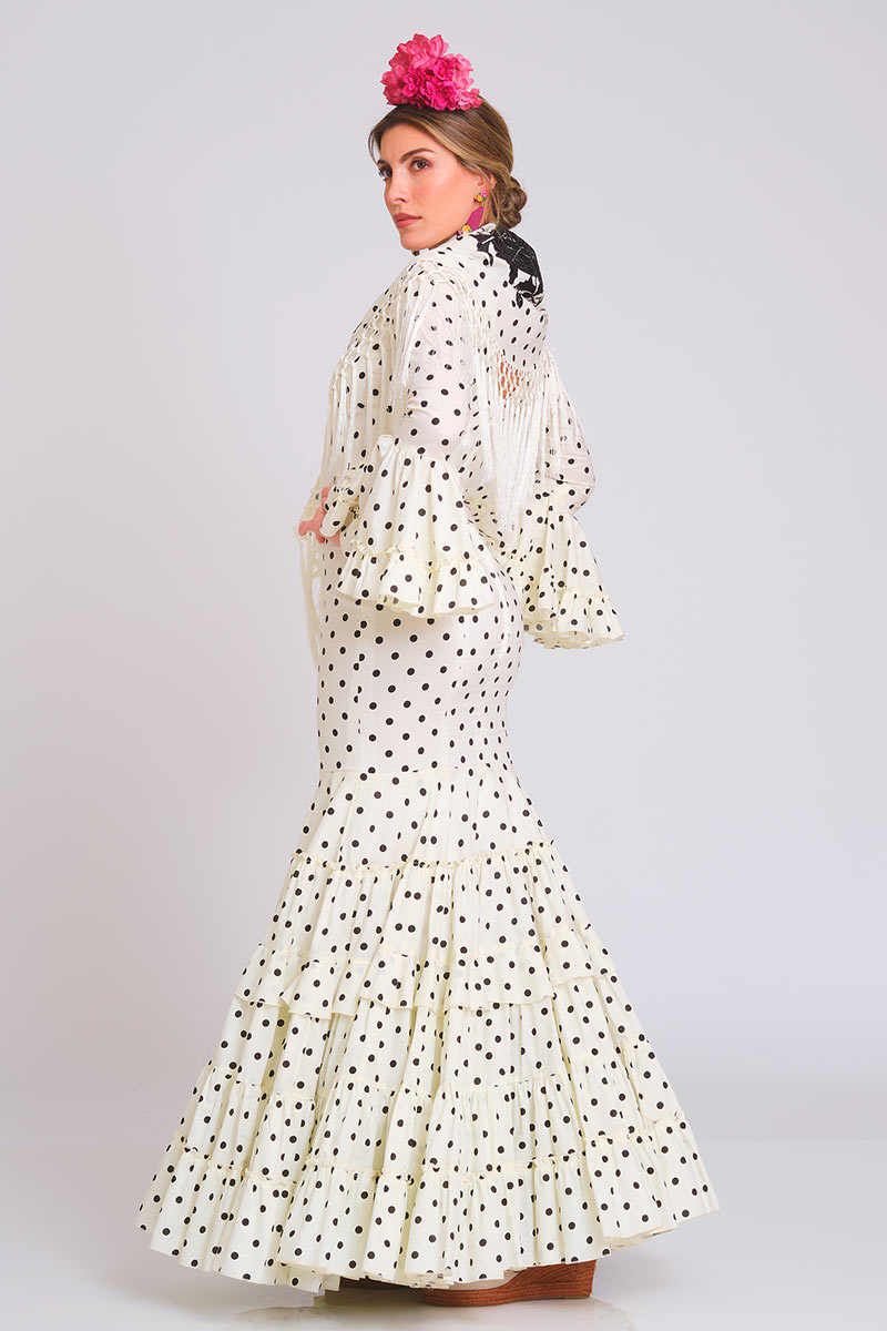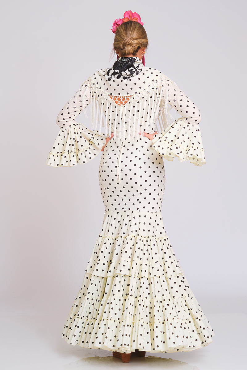 Mangas de largo medio con volantes. Escote de pico en delantero y espalda. Enagua de algodón sin cancán. Bolsillo interior con cremallera y presillas de cuelgue.