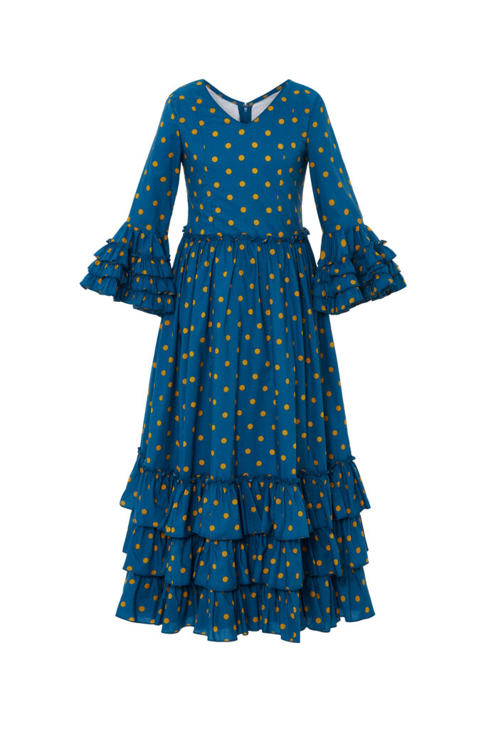 Vestido con falda fruncida y tres volantes fruncidos en bajo con cabecilla.