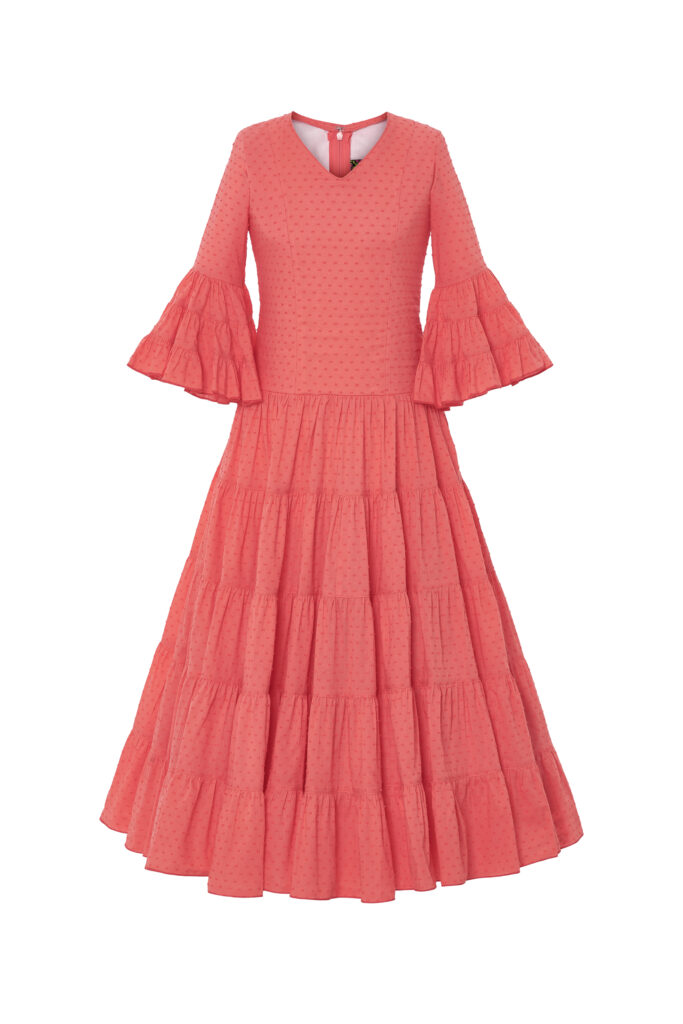 Vestido canastero liso de plumety de algodón. Confeccionado siguiendo un patrón con escote en pico y mangas a medio brazo con volante canastero de tres cortes. Falda canastera de cinco cortes desiguales. Falda interior con volante de tarlatana para aumentar el volumen en el bajo. Las mangas de largo a medio brazo y con un volante canastero. El vestido lleva bolsillo interior y presillas de cuelgue.