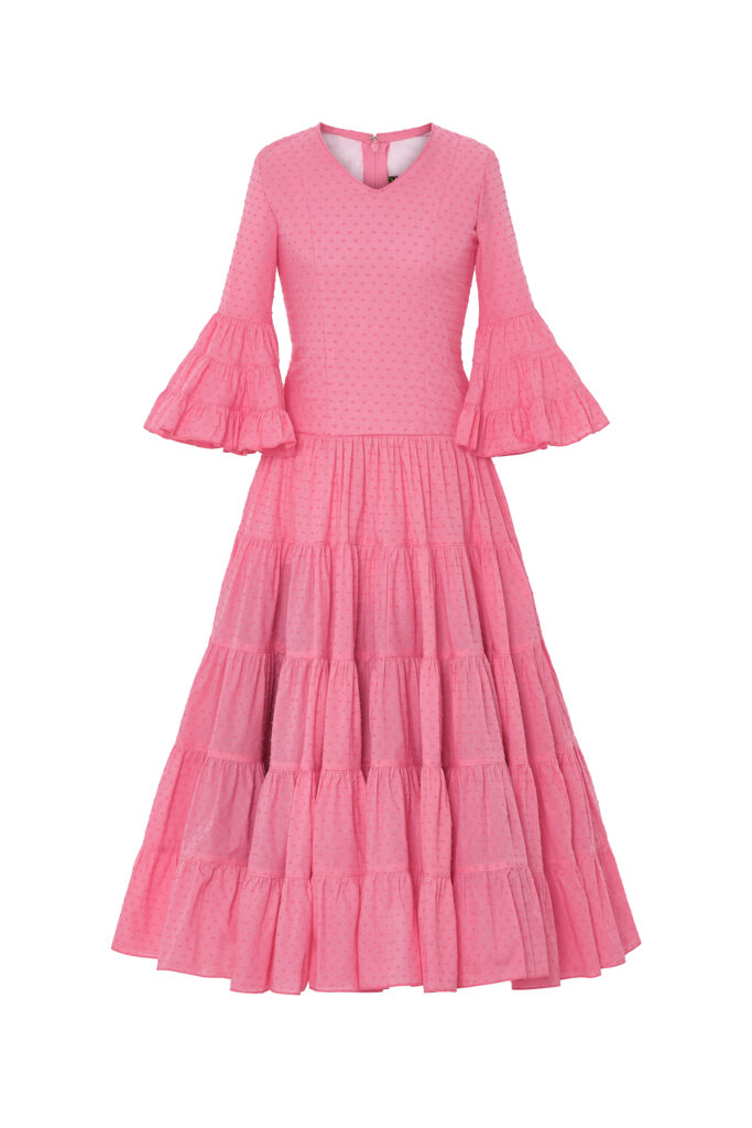 Vestido canastero liso de plumety de algodón. Confeccionado siguiendo un patrón con escote en pico y mangas a medio brazo con volante canastero de tres cortes. Falda canastera de cinco cortes desiguales. Falda interior con volante de tarlatana para aumentar el volumen en el bajo. Las mangas de largo a medio brazo y con un volante canastero. El vestido lleva bolsillo interior y presillas de cuelgue.