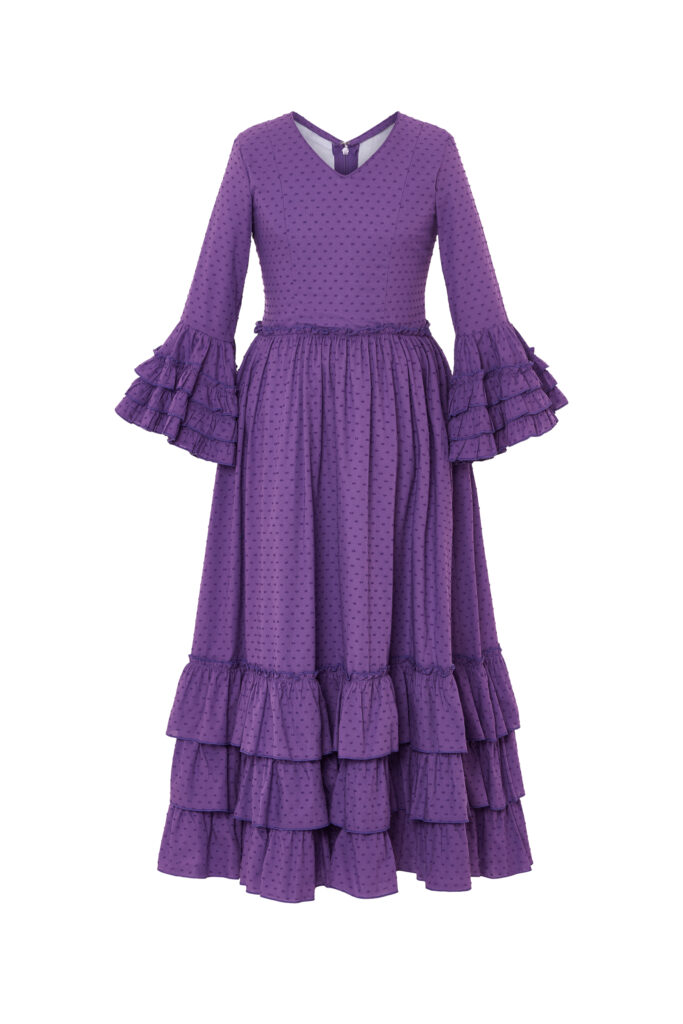 Vestido confeccionado en plumety de algodón de color liso. El patrón confalda fruncida y tres volantillos con cabecilla en el bajo. TIene enagua con volante de tarlatana o cancan. Escote en pico y mangas a medio brazo con dos volantes de capa. . El vestido lleva bolsillo y presillas de cuelgue.
