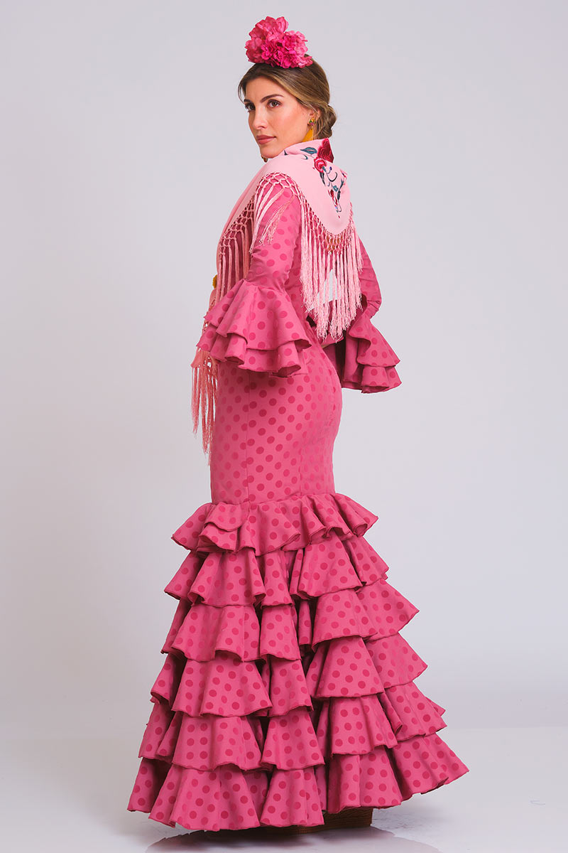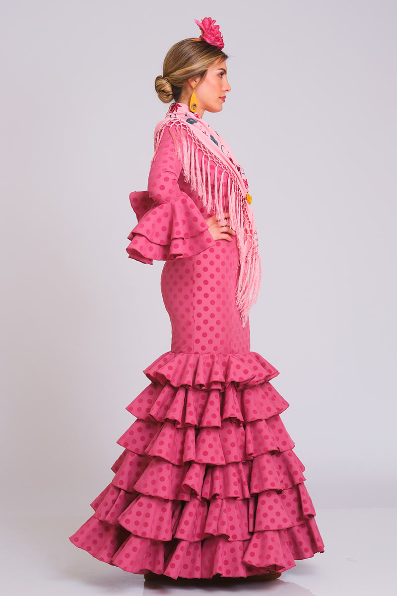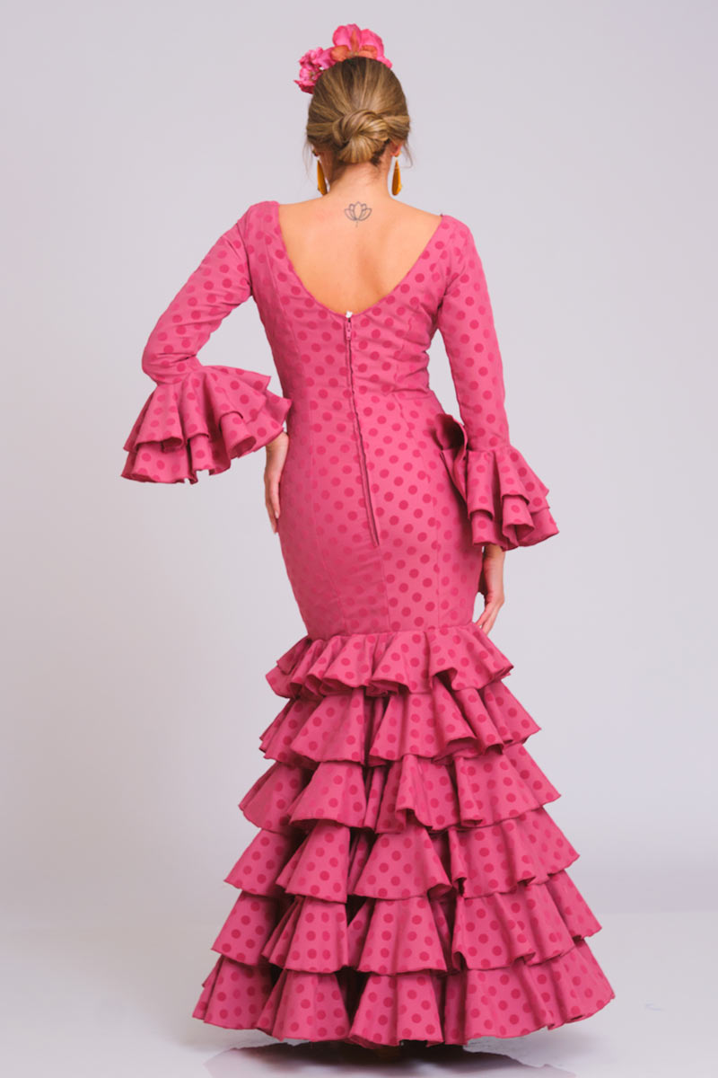 Vestido de flamenca confeccionado en strech de poliéster con lunares de 15 mm de diámetro de terciopelo distribuidos en un diseño homogéneo.