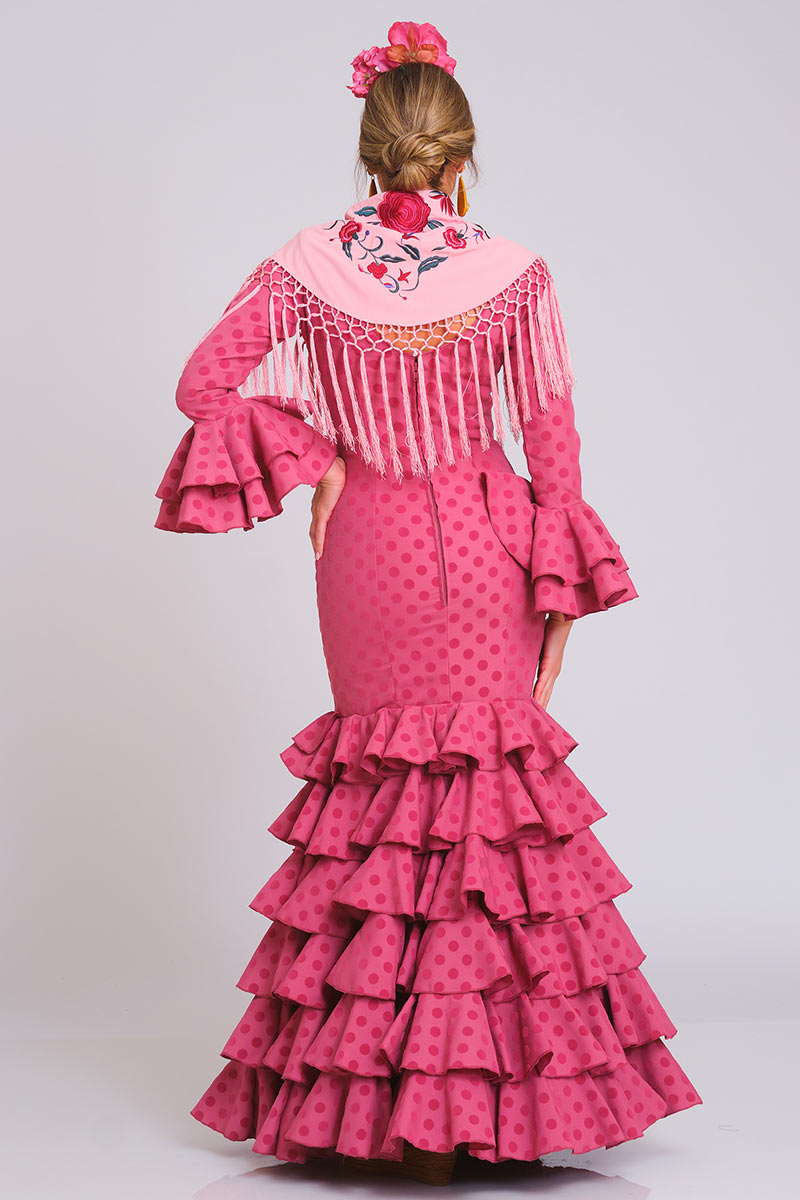 Diseño estilizado con escote de pico en delantero y espalda. Manga de largo medio con remate de dos volantes. Falda con 6 volantes rematados con cordoncillo al tono.