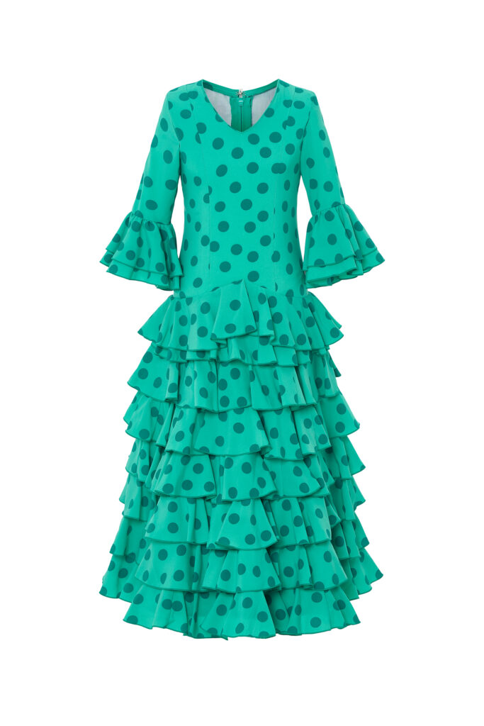 Vestido de siete volantes con talle bajo cadera con estampado de lunares salpicados . El primer volante y más alto está cosido en pico en el centro delantero, dándole un toque muy coqueto al diseño. Los volantes van rematados con repulgo. El escote de pico en el delantero y en la espalda. Bajo esta falda interior lleva un bolsillo y presillas para el cuelgue.