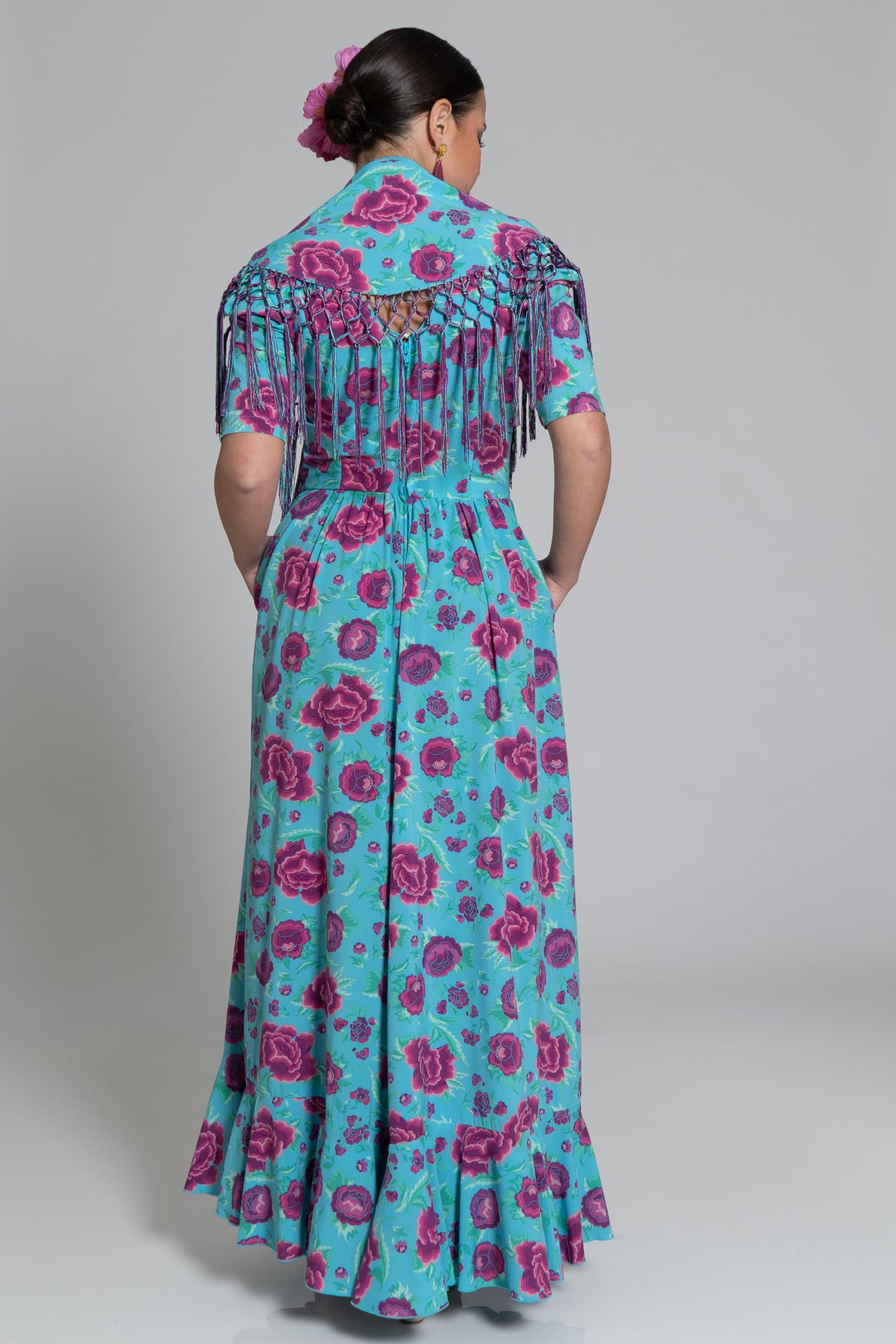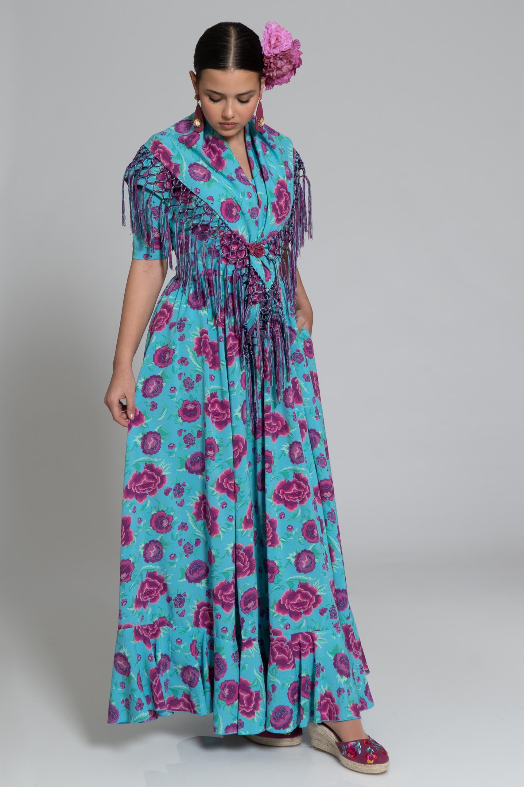 Disponemos de otros vestidos con el mismo estampado en diferente color y con corte o ptatrón diferente. La fotogrfía muestr el mantoncillo a juego con el estampado que lo pueden encontrar en la sección de Mantoncillos con el nombre de » mantoncillo manila» color turquesa.